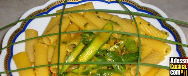 Nella foto, Rigatoni con zucchine e fiori in giallo