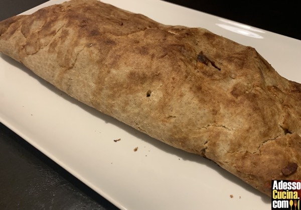 Fare una sfoglia sottile e sistemare sopra tutti gli ingredienti della farcitura, spolverizzarla di zucchero ed arrotolarla su se stessa. Mettere in forno, su una placca foderata con carta forno a 200°C